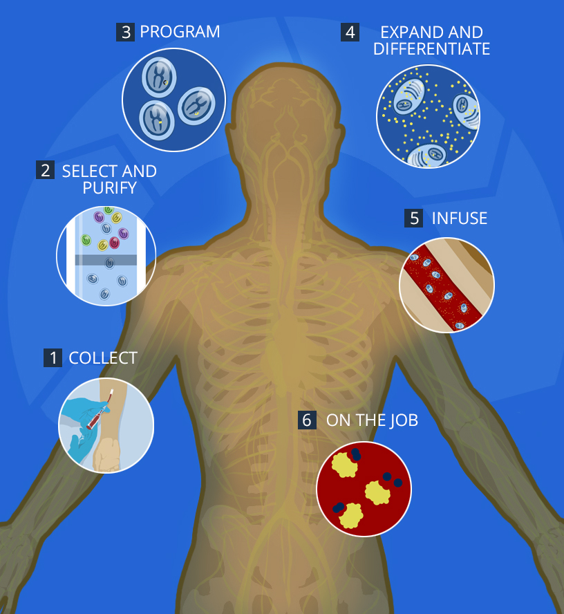 Once we have programmed the B cells we expand the number and differentiate into plasma cells that produce massive amounts of our therapeutic protein. Once in the clinic, we will then infuse the ISP™ programmed cells back into the same patient, where we expect they will take up residence and produce therapeutic proteins for extended periods of time.